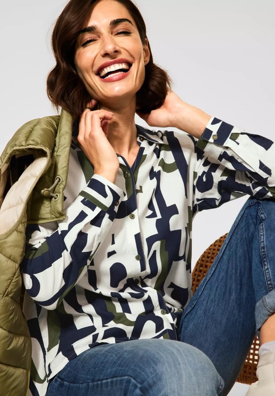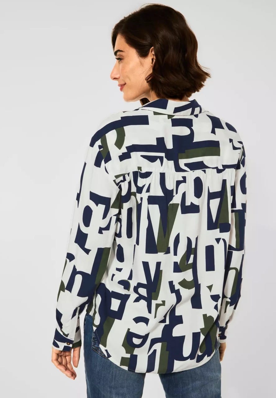 Cecil Blouses B343070 4063041308302 Blouse van Cecil met een letterprint, lange hold-up mouwen, kraag, knoopsluiting en een iets langere achterzijde. Materiaal: Viscose 100% |