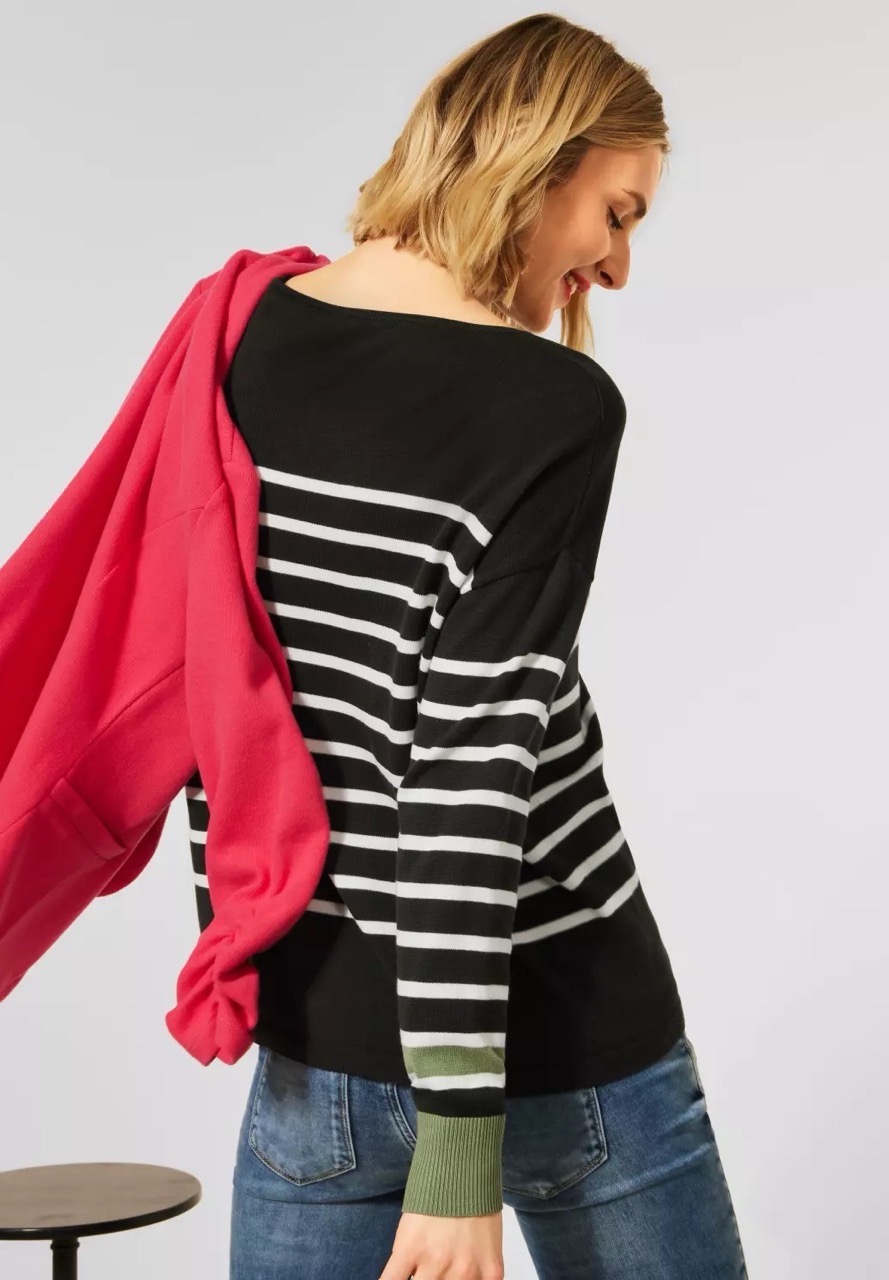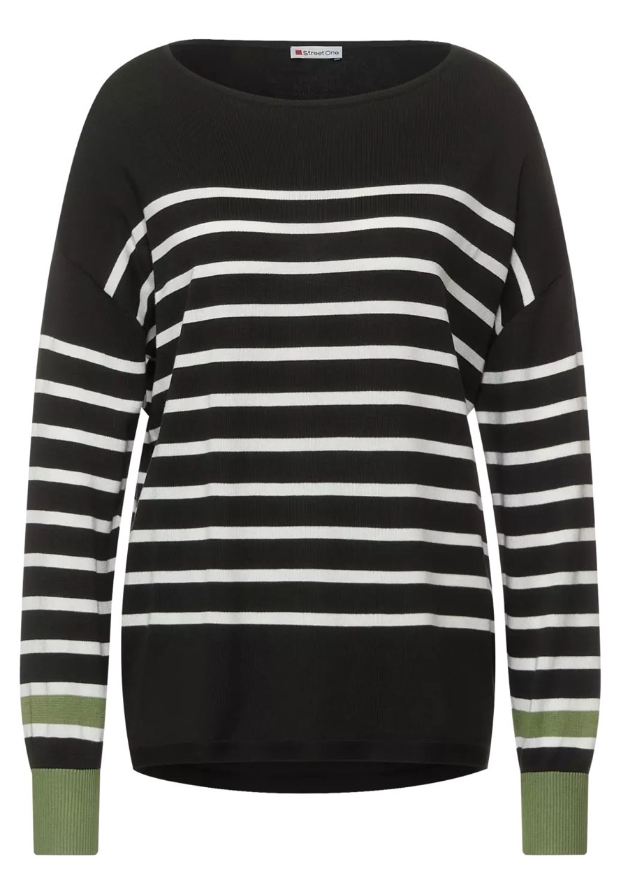Street One Truien en Vesten A301827 33610 4063052809447 Oversized gebreide pullover van Street One in een strepen dessin met lange mouwen, boothals, verlaagde schoudernaden en contrasterende ribgebreide boorden. Materiaal: Viscose 60%| katoen 40% |
