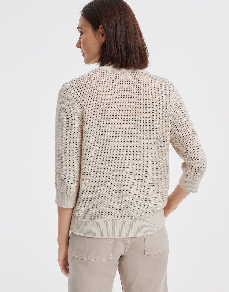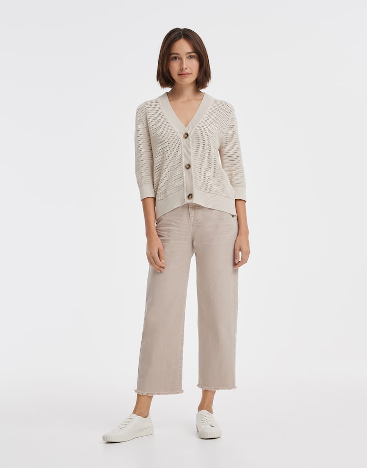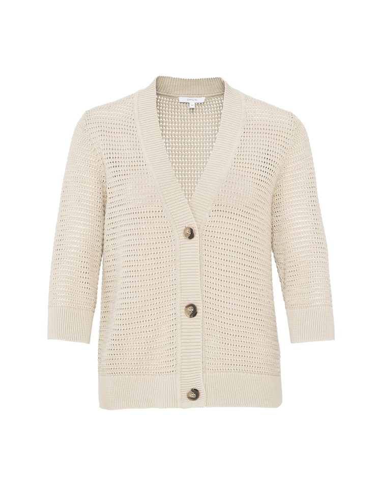 Opus Truien en Vesten 10022510282120 4251892230617 Gebreid vest van Opus in een gehaakt dessin met driekwart mouwen, V-hals, knoopsluiting en ribgebreide boorden. Materiaal: Katoen 100% |