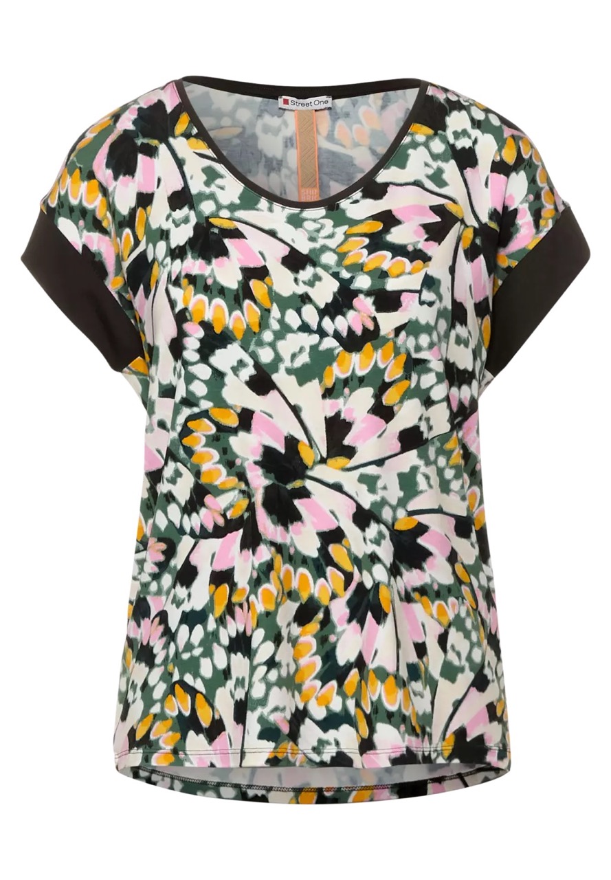 Street One Tops en Shirts A317664 4063052921750 Shirt van Street One in een all-over dessin met korte aangeknipte mouwen en een ronde V-hals. Materiaal: EcoVero viscose 95%| elastan 5% |