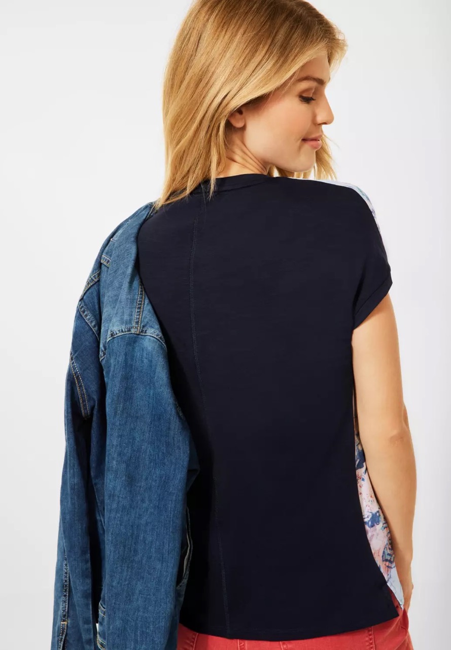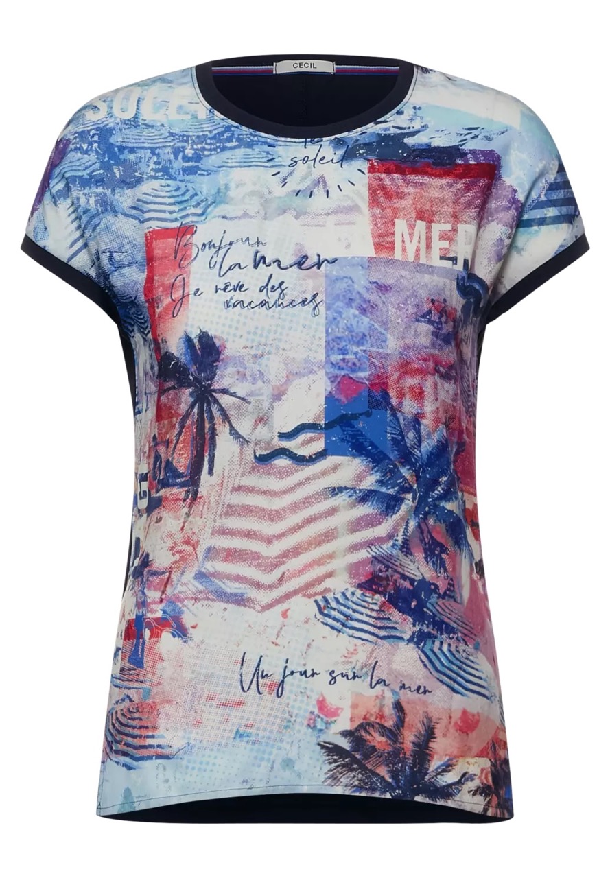 Cecil Tops en Shirts B317612 4063041399034 Shirt van Cecil met een print aan de voorzijde en een effen achterzijde, korte aangeknipte mouwen en een ronde hals. Materiaal: Viscose 100%. Achterzijde: Katoen 100% |