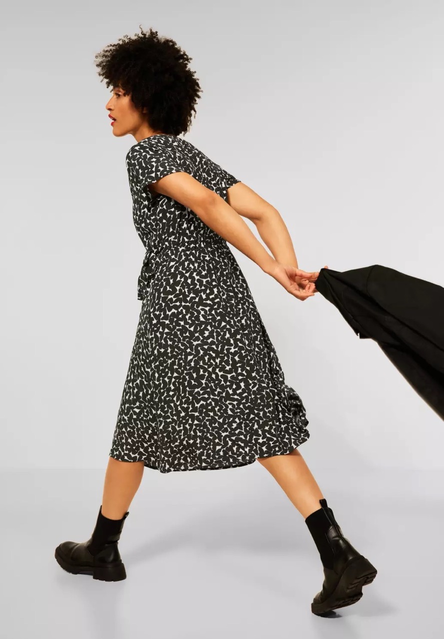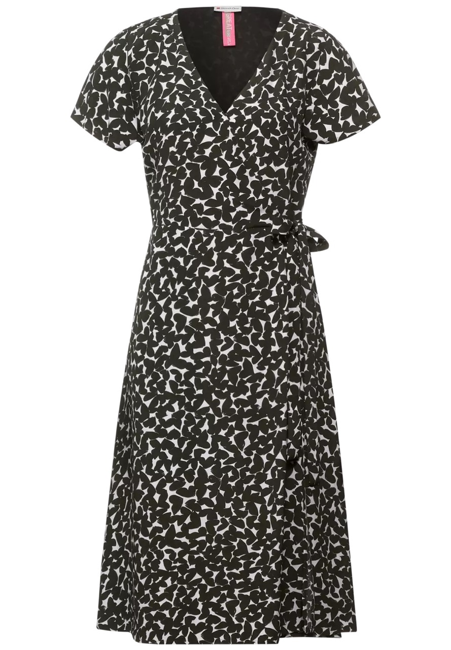Street One Jurken en Rokken A143175 4063052893361 Jurk van Street One in een all-over dessin met korte mouwen, V-hals, drukknoopsluiting en een strikceintuur in de taille. Materiaal: Viscose 100% |