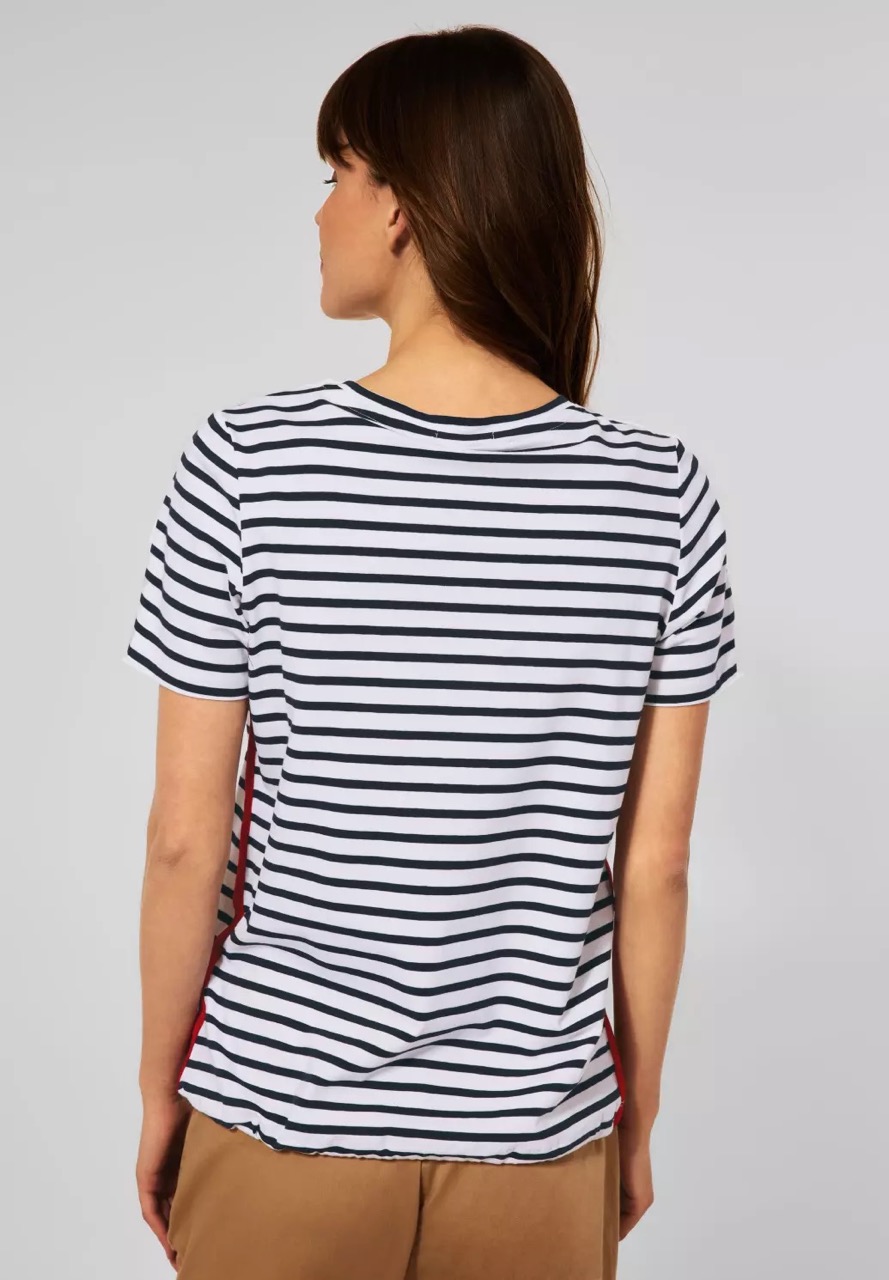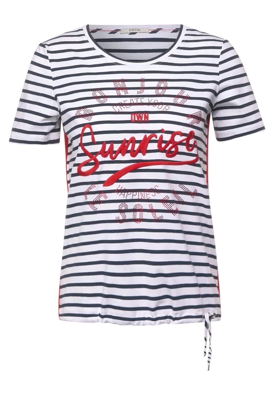 Cecil Tops en Shirts B317646 4063041399348 Gestreept T-shirt van Cecil met een tekstprint aan de voorzijde, korte mouwen, ronde hals en een trekkoord in de zoom. Materiaal: Katoen 96%| elastan 4% |