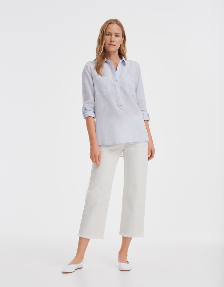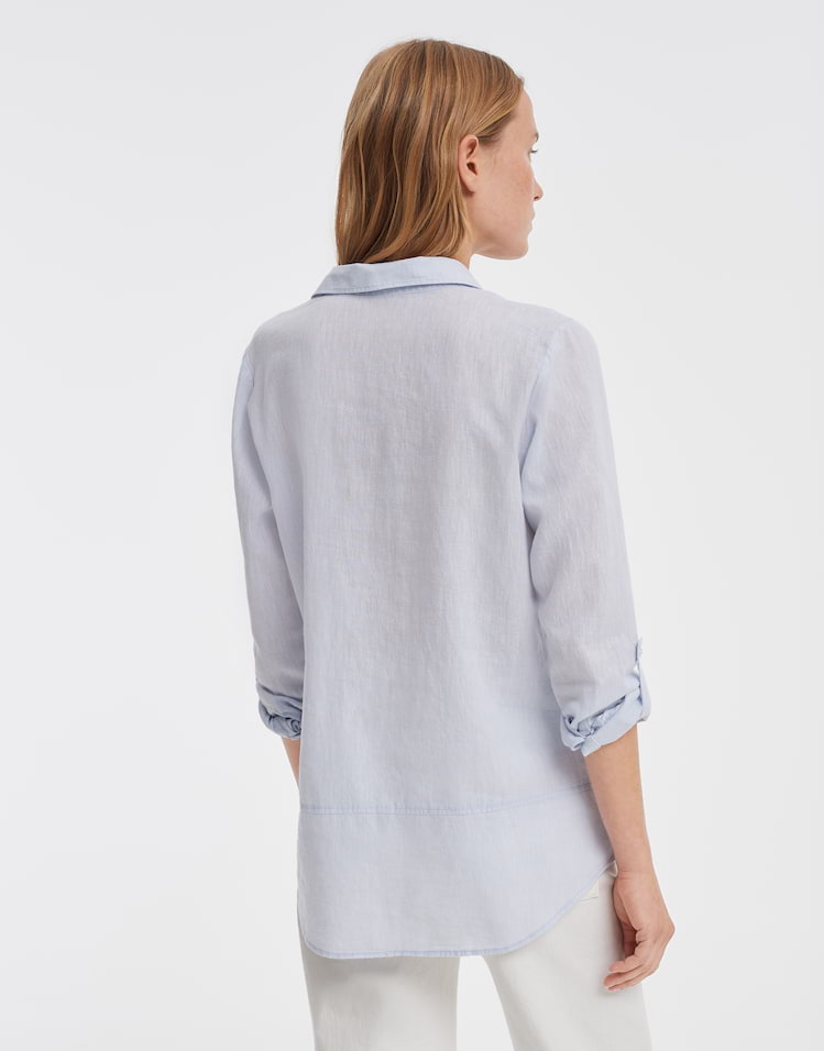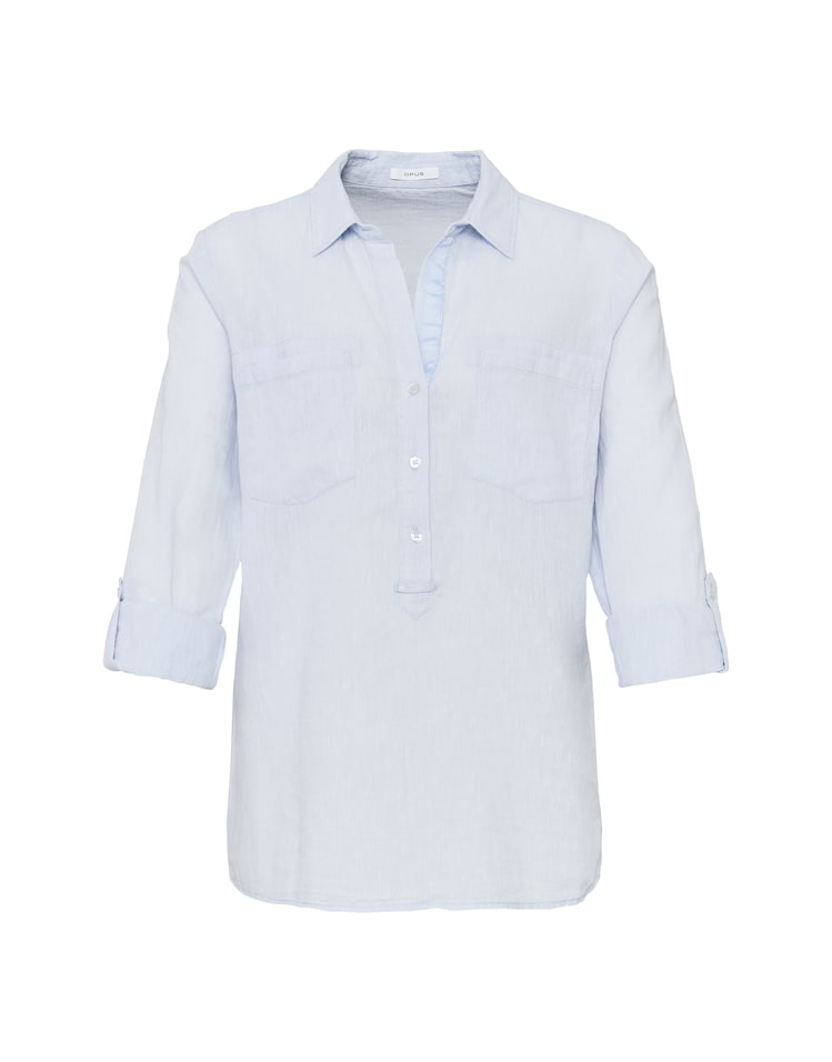 Opus Blouses 2181210334100 4251892227211 Linnen blouse van Opus in een gemĂȘleerd dessin met lange hold-up mouwen, kraag, korte knoopsluiting en twee opgestikte borstzakken. Materiaal: Linnen 55%| katoen 45% |