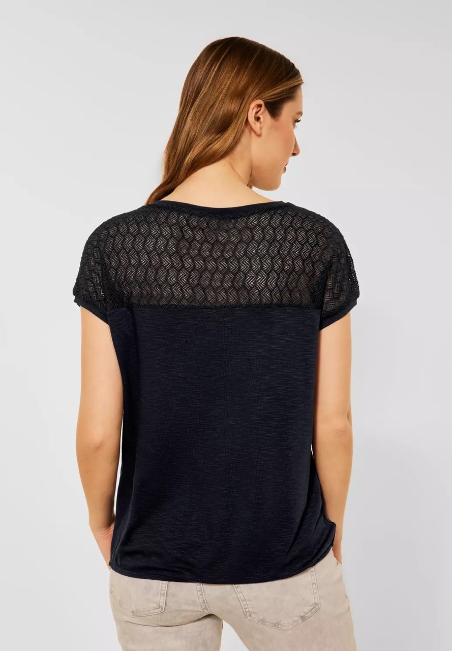 Street One Tops en Shirts A318021 4063053086137 T-shirt van Street One met een kanten boven zijde, aangeknipte mouwen, ronde hals en een elastische zoom. Materiaal: Eco viscose 95%| elastan 5% |
