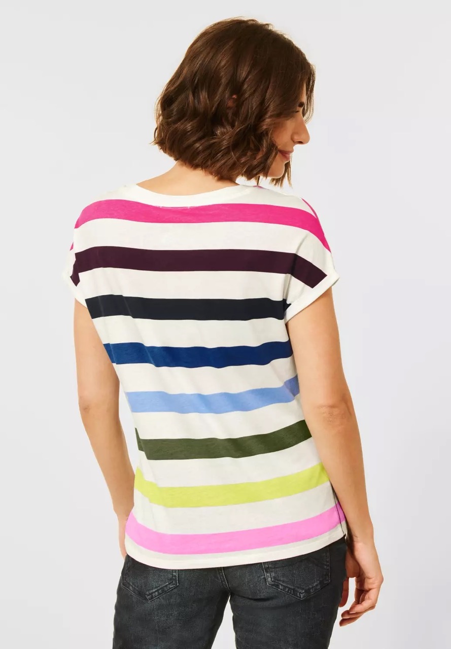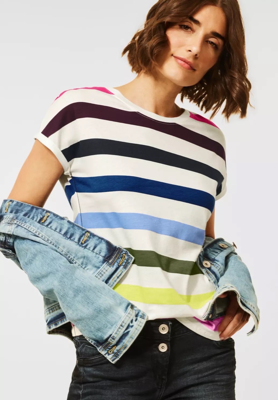 Cecil Tops en Shirts B317972 4063041554235 Gestreept mulitcolour shirt van Cecil met korte aangeknipte mouwen en een ronde hals. Materiaal: Modal 50%| katoen 50% |
