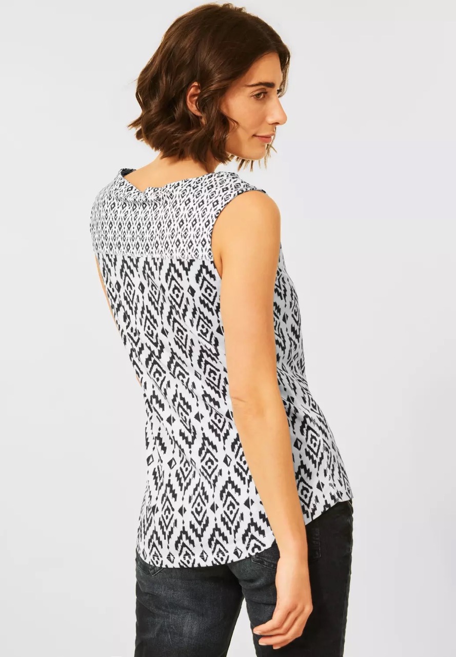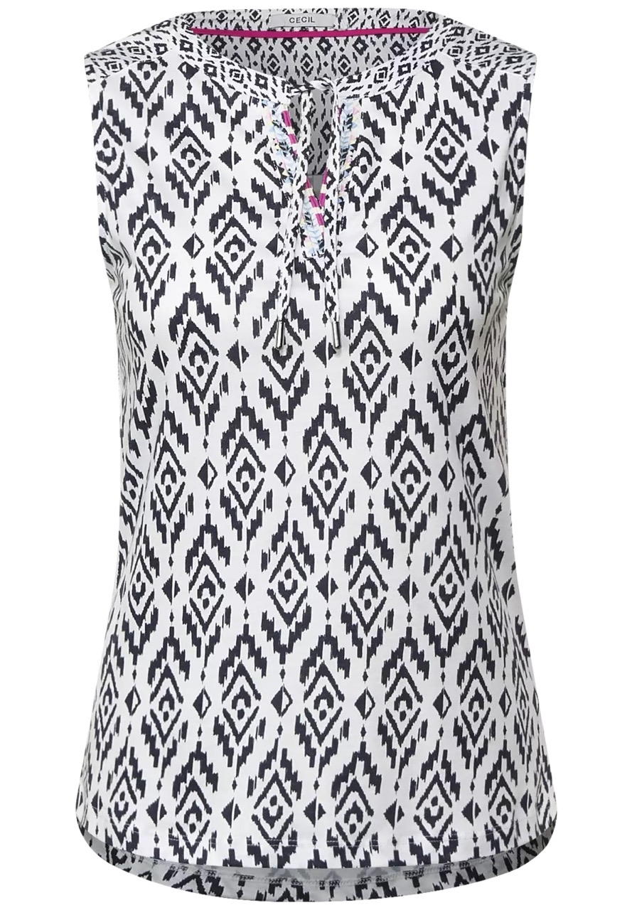 Cecil Tops en Shirts B317973 4063041554525 Mouwloze top van Cecil in een ikat-print met een ronde hals voorzien van split, tuniekbandjes en subtiel borduursel. Materiaal: Modal 50%| katoen 50% |