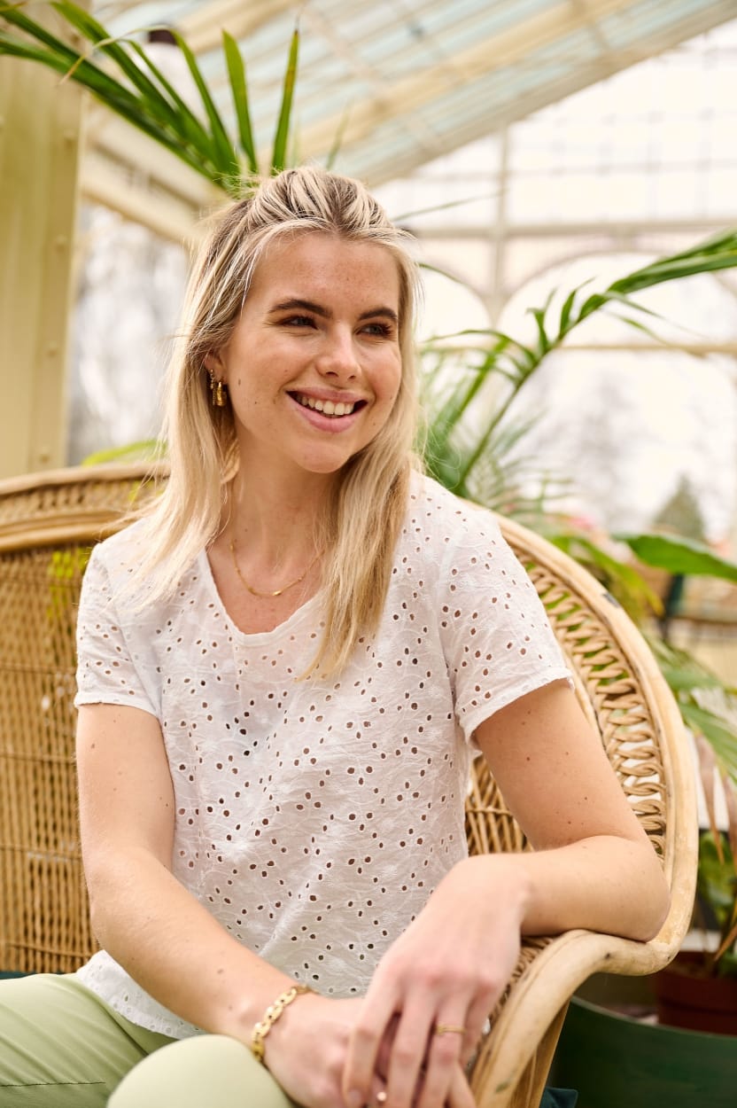 Fos fashion Blouses MIA 6169 2000000504858 Broderie shirt van Fos Amsterdam met korte mouwen, ronde hals en een cut-out detail aan de achterzijde. Materiaal: Katoen 100% |