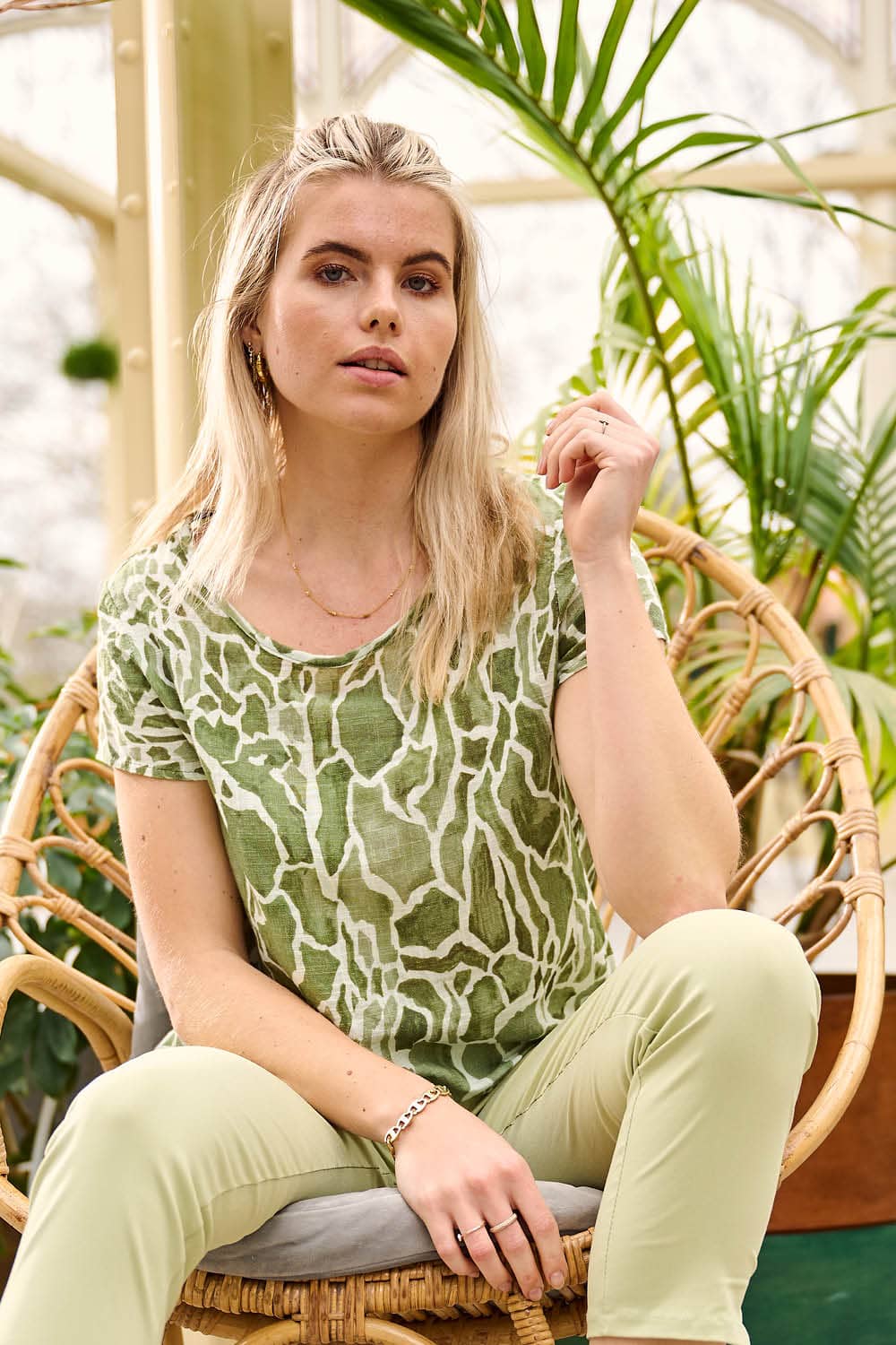 Fos fashion Blouses 6109 MIA GIRAFF 2200000281142 Shirt van Fos Amsterdam in een giraffen dessin met korte mouwen, ronde hals, keyhole aan de achterzijde en een afgeronde onderzijde. Materiaal: Linnen 100% |