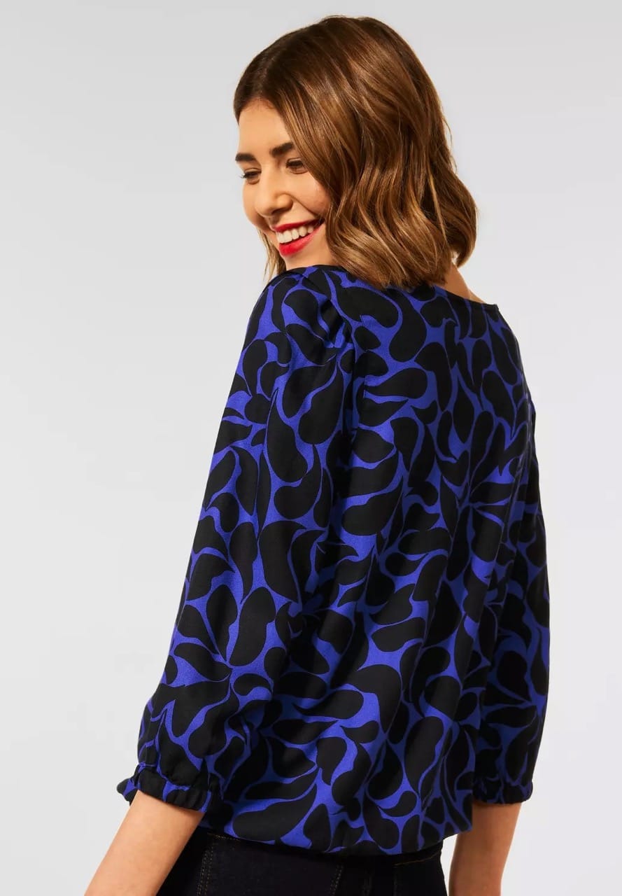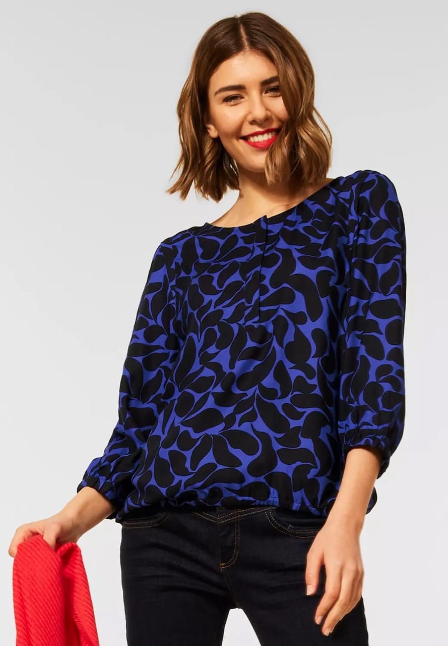 Street One Blouses A342979 20001 4063052673680 Blouse van Street One in een all-over dessin met lange mouwen, ronde hals, verlaagde schoudernaden, halve verborgen knoopsluiting en elastische manchetten. Materiaal: EcoVero viscose 100% |