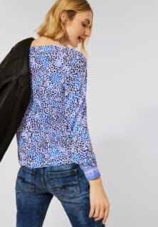 Street One Tops en Shirts A317363 30108 4063052756987 Shirt van Street One in een materialen mix met bloemen dessin, lange mouwen voorzien van elastische manchetten met tekstprint en een V-hals. Materiaal: Voorkant EcoVero viscose 95%| elastan 5%. Achterkant EcoVero viscose 100% |