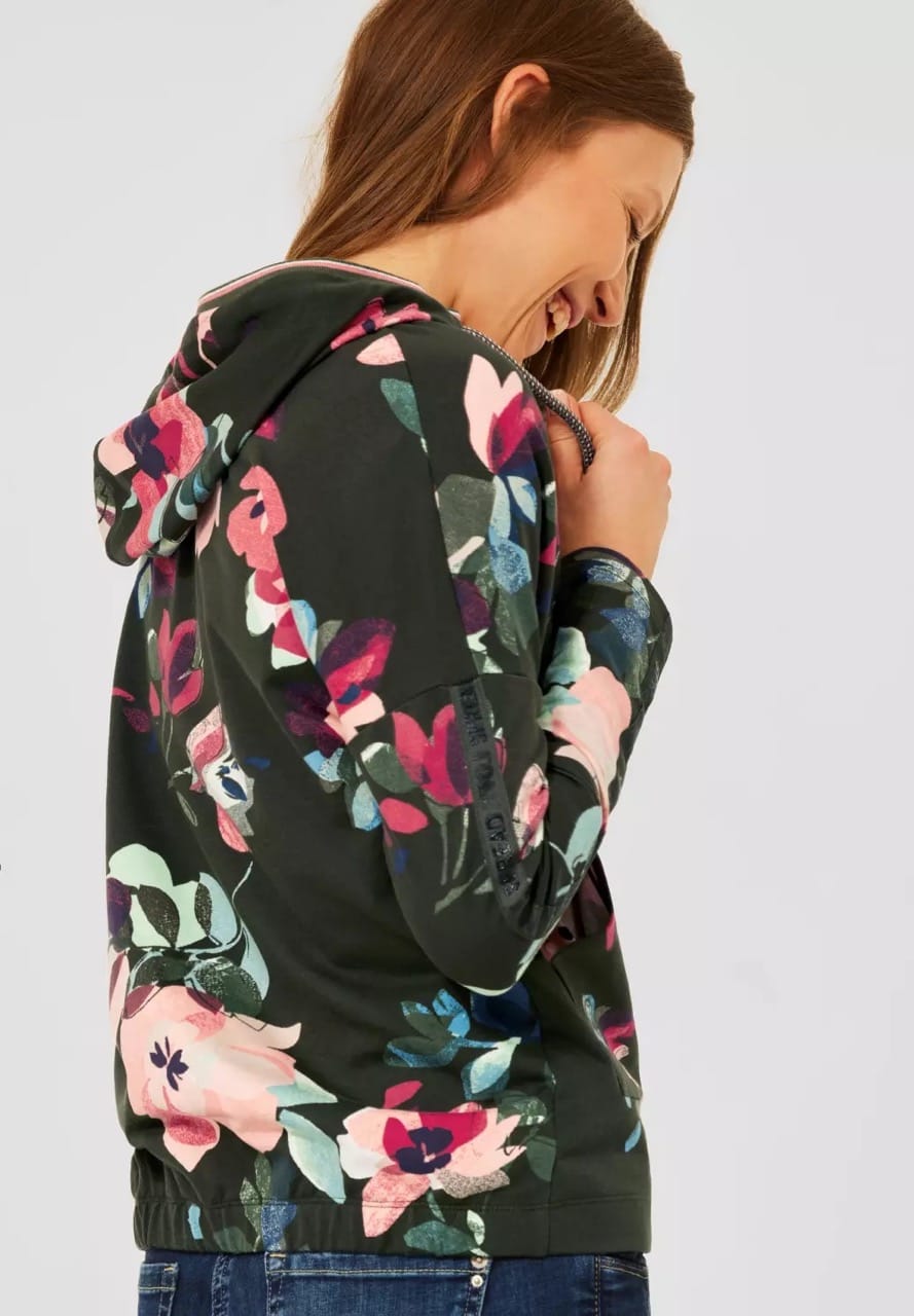 Cecil Truien en Vesten B317385 4063041251332 Vest van Cecil in een bloemen dessin met lange mouwen voorzien van tekstbies, verlaagde schoudernaden, ritssluiting, capuchon met trekkoord en twee steekzakken. Materiaal: Katoen 95%| elastan 5% |