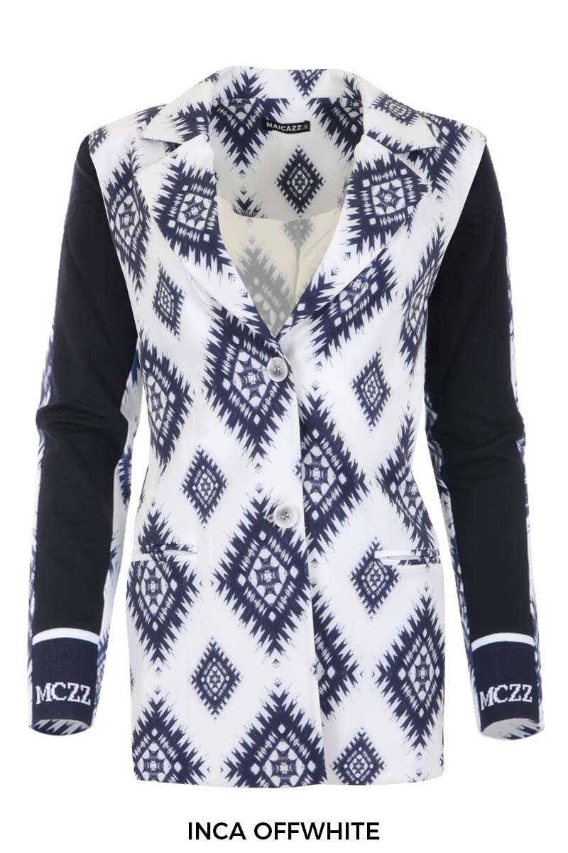 Maicazz Blazers SP22.10.302 VAV 8785415185628 Blazer van Maicazz in een grafisch dessin, reverskraag, 2-knoopssluiting, lange taps toelopende mouwen, getailleerde deelnaden en twee paspelzakken aan de voorzijde. Materiaal: Viscose 100% |