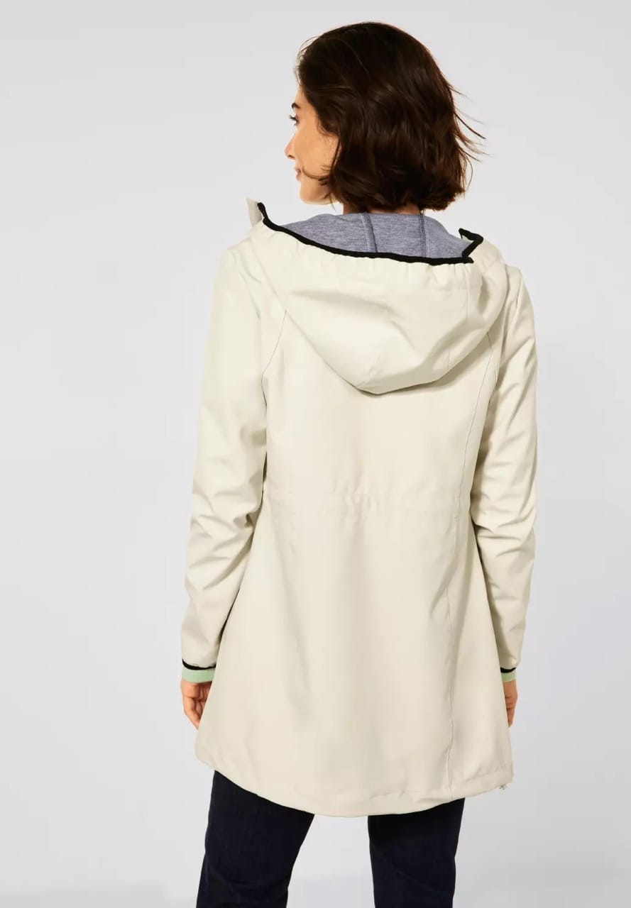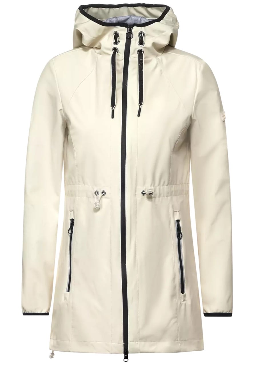 Cecil Jassen B100711 4063041151076 Softshell jas van Cecil met een capuchon voorzien van trekkoord, lange raglanmouwen, elastische manchetten, verstelbaar elastiek in de taille, twee ritszakken en een deelbare ritssluiting. Materiaal: Polyester 90%| elastan 10% |