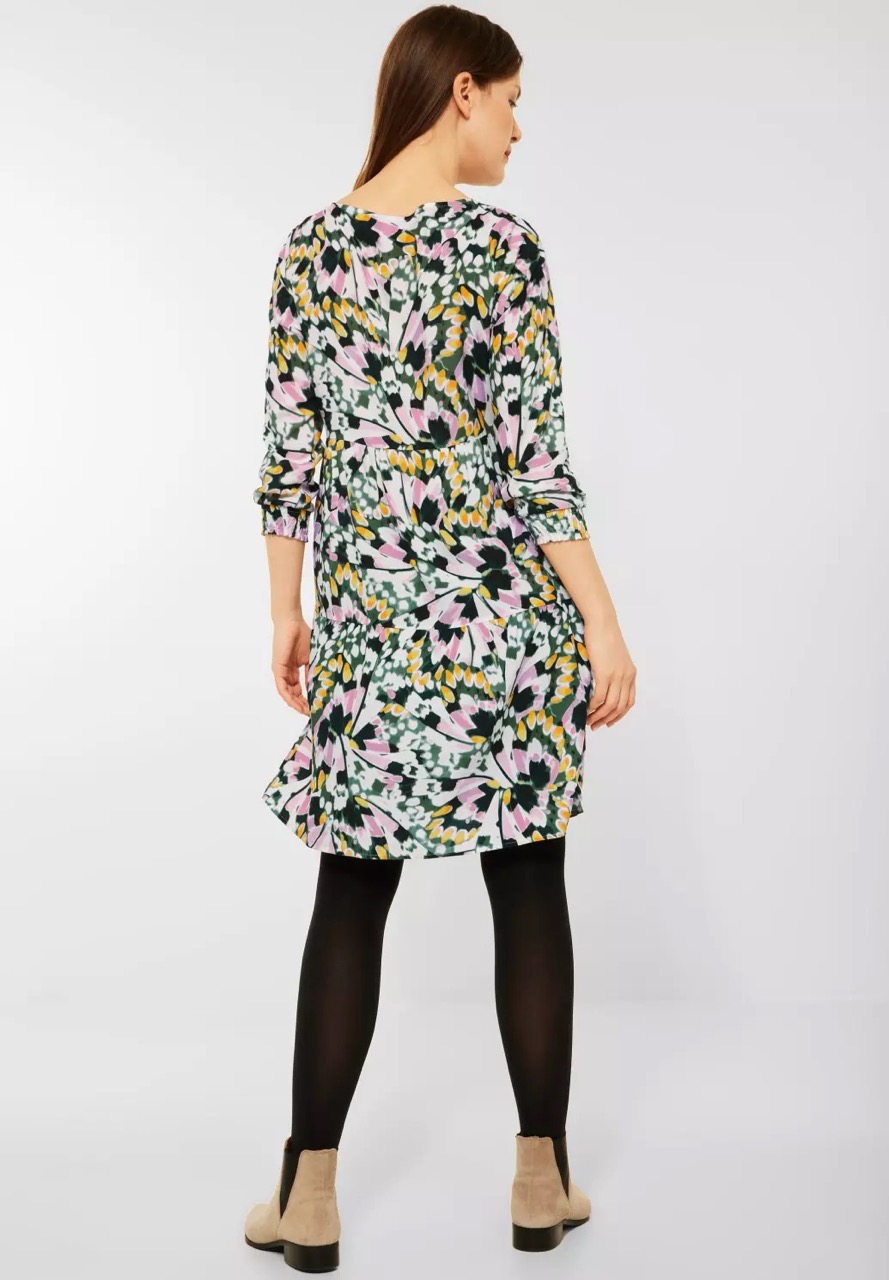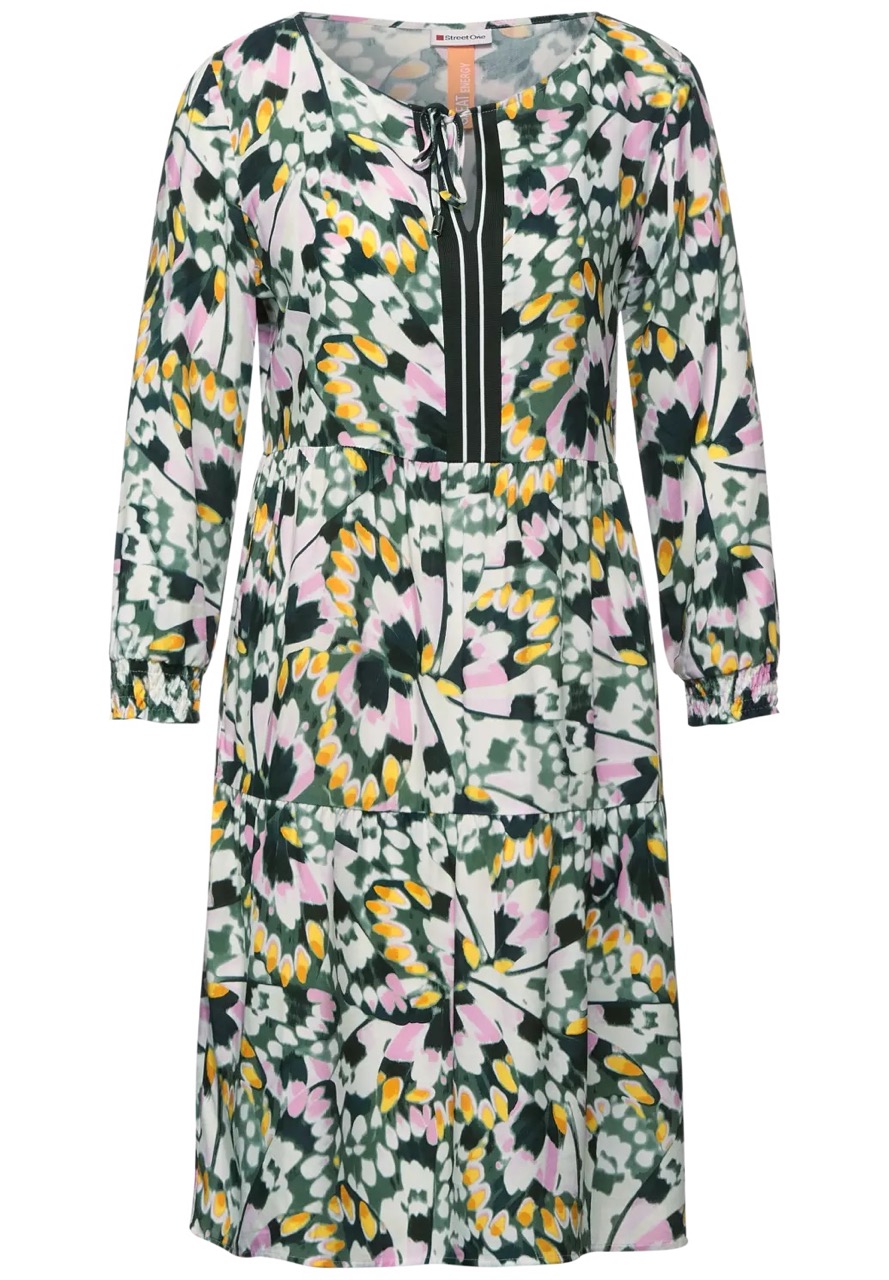 Street One Jurken en Rokken A143168 4063052891237 Jurk van Street One in een all-over dessin met driekwart mouwen, ronde hals voorzien van split en strikdetail, elastische manchetten en volants aan de zoom. Materiaal: Viscose 100% |