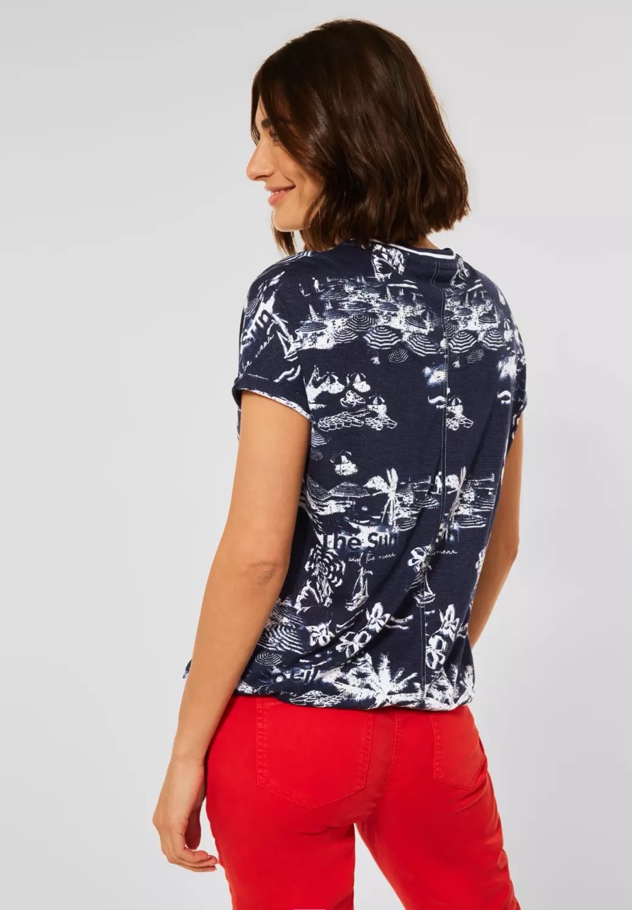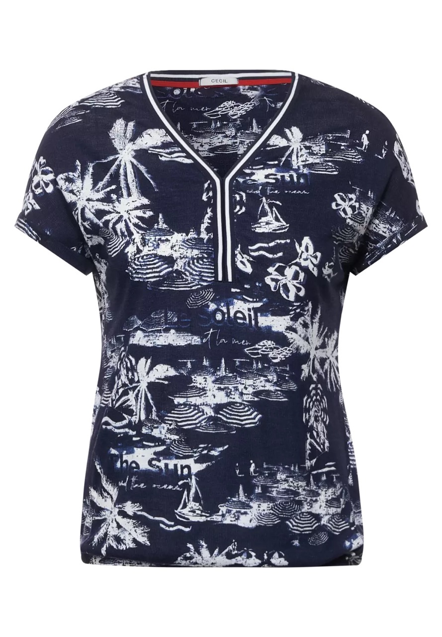 Cecil Tops en Shirts B317647 4063041384801 T-shirt van Cecil in een all-over dessin met korte aangeknipte schouders, V-hals en een elastische zoom. Materiaal: Modal 50%| katoen 50% |