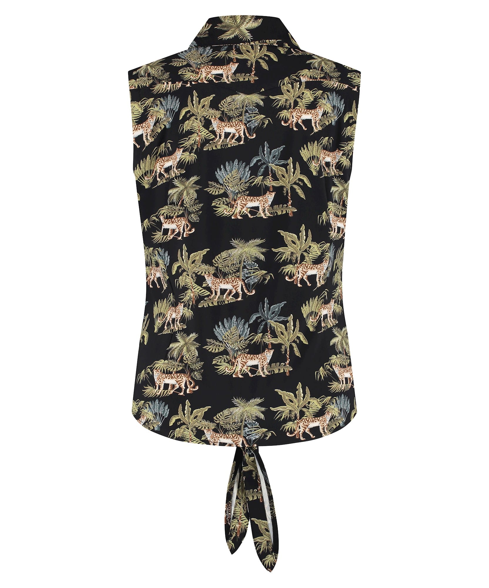 Lady day Blouses M27.388.0401 BIBI 8720696608145 Mouwloze blouse van Lady Day in travel kwaliteit met een all-over dessin, kraag, knoopsluiting en strikdetail aan de voorzijde. Materiaal: Polyamide 80%| elastan 20% |