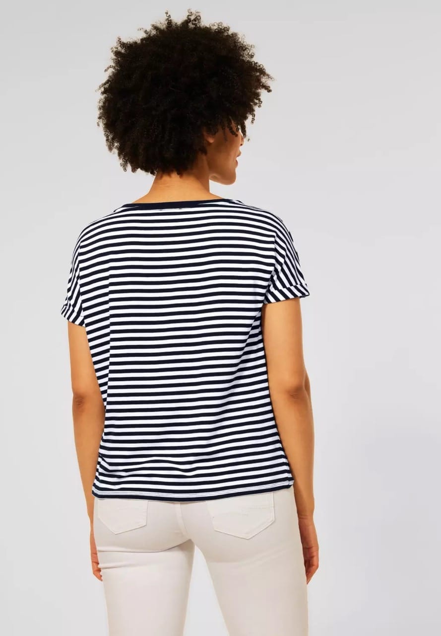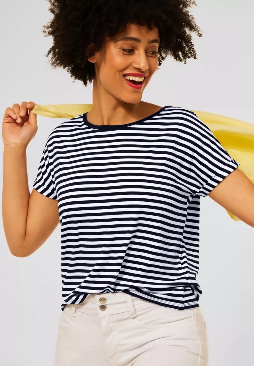Street One Tops en Shirts A317784 4063052978266 Gestreept T-shirt van Street One met korte aangeknipte mouwen en een ronde hals. Materiaal: EcoVero viscose 95%| elastan 5% |