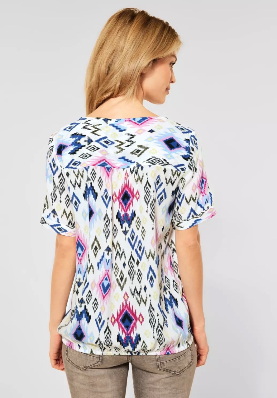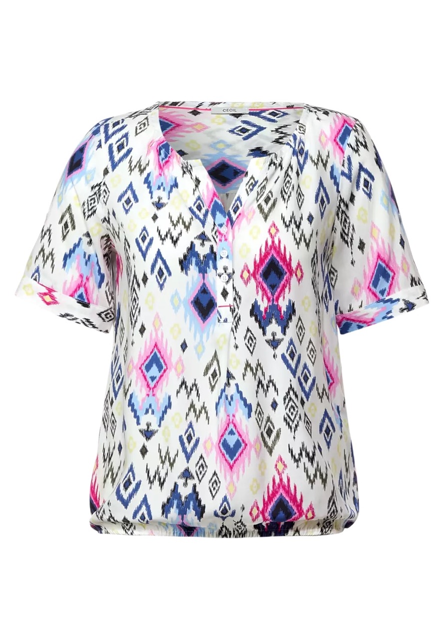 Cecil Blouses B343262 4063041556925 Blouse van Cecil in een all-over dessin met korte hold-up mouwen, ronde hals hals voorzien van split en korte knoopsluiting en een elastische tailleband. Materiaal: Viscose 100% |