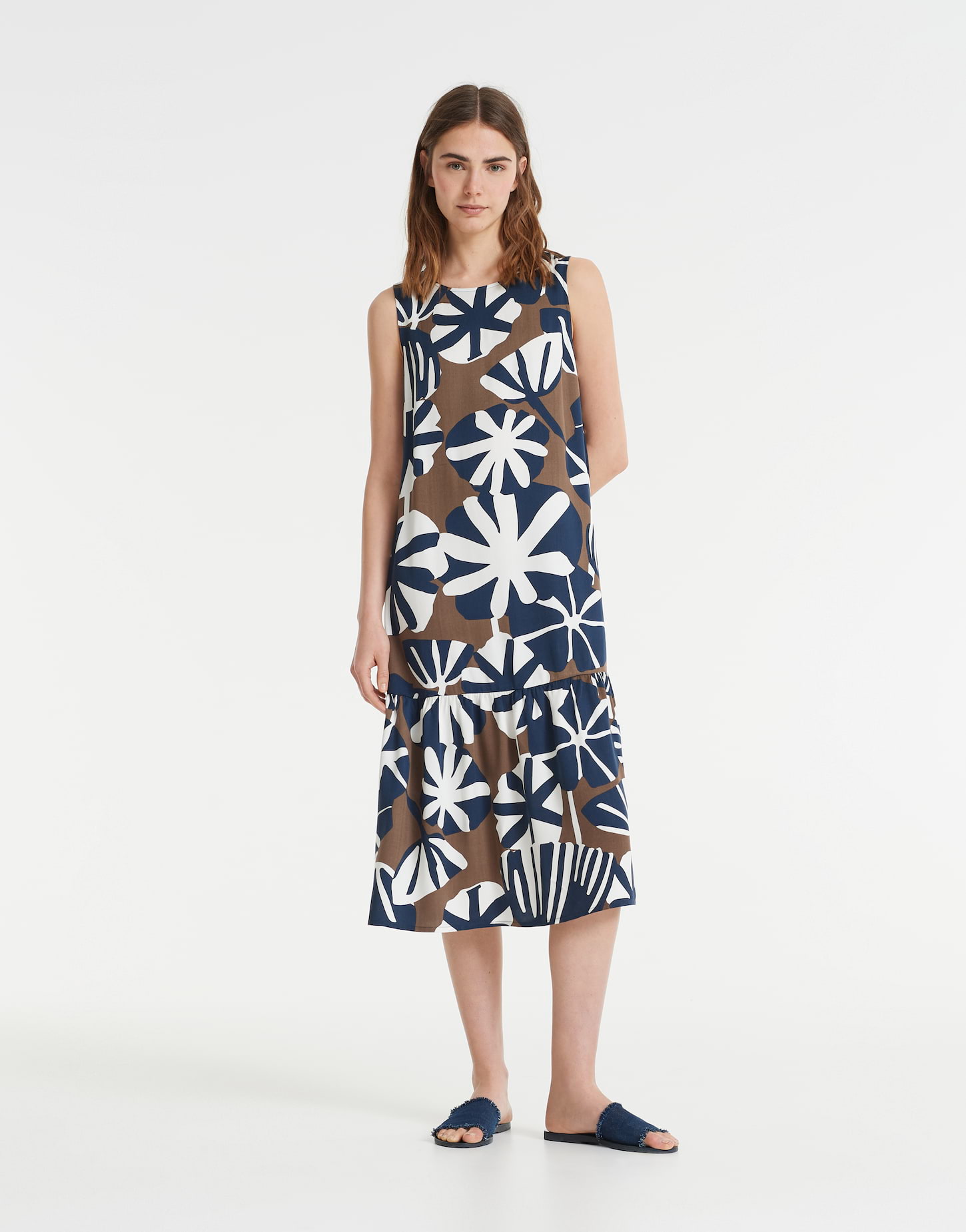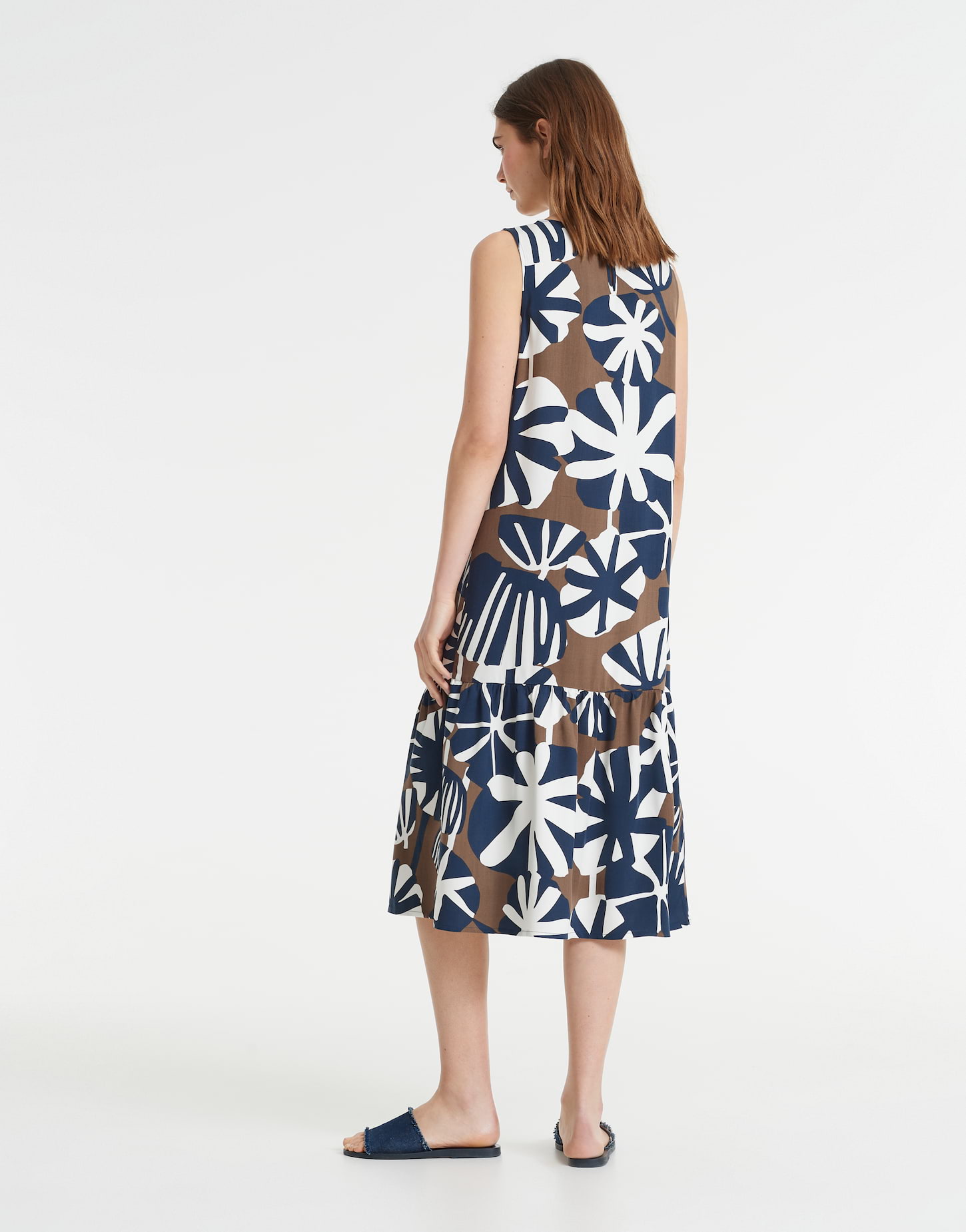 Opus Jurken en Rokken 10057810778123 4251892257133 Mouwloze zomerjurk van Opus in een bloemen dessin met een ronde hals met split en knoop aan de achterzijde en een brede volant aan de onderzijde. Materiaal: EcoVero viscose 100% |