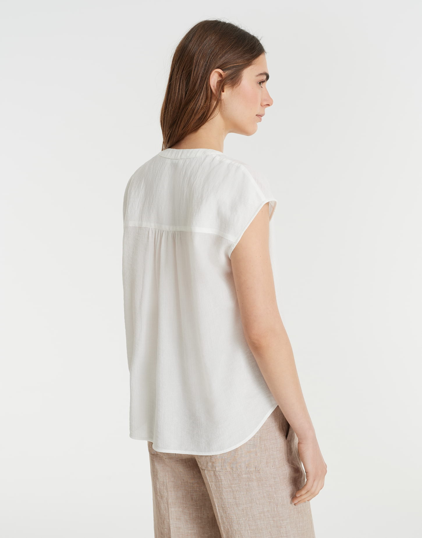 Opus Blouses 1005285756100 4251892269426 Blouse van Opus in een structuur dessin met een V-hals, korte aangeknipte mouwen, schouderstuk voorzien plooien en een afgeronde zoom. Materiaal: Viscose 85%| polyamide 15% |
