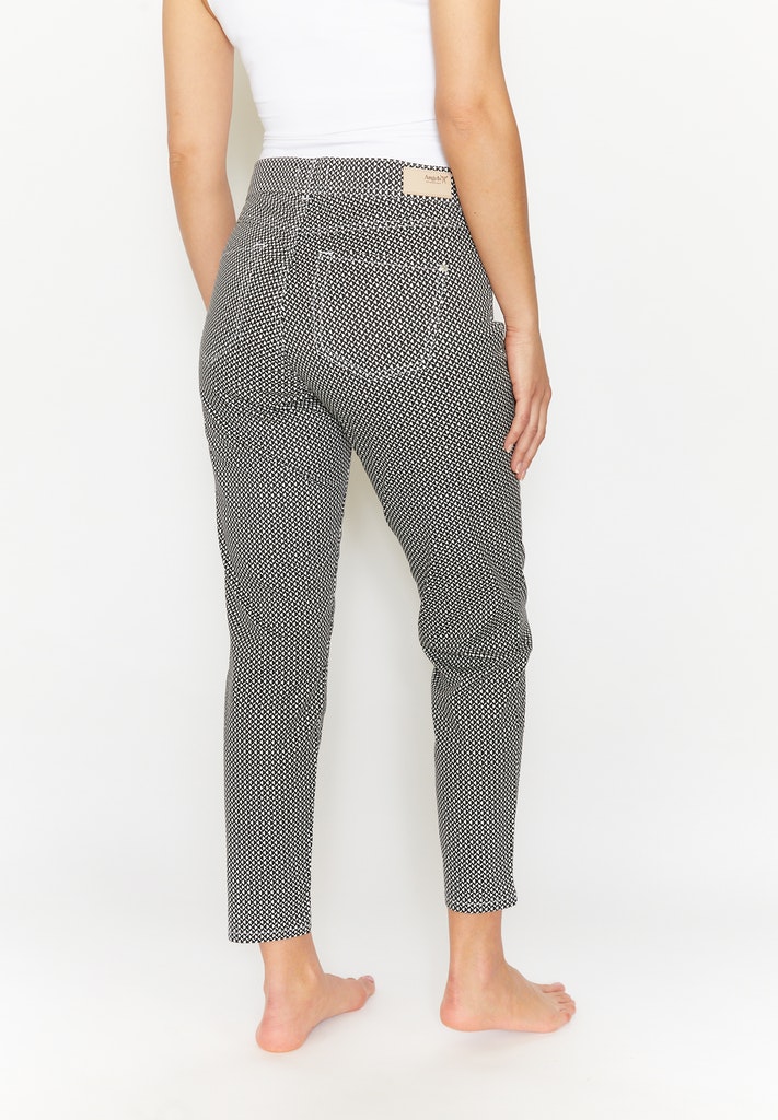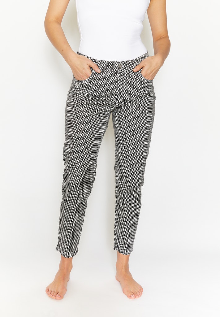 Angels Broeken 963-680007 ORNE 4062258866636 5-pocket enkellange broek van Angels in een all-over dessin met een knoop-en ritssluiting. Materiaal: Katoen 77%| polyester 21%| elastan 2% |