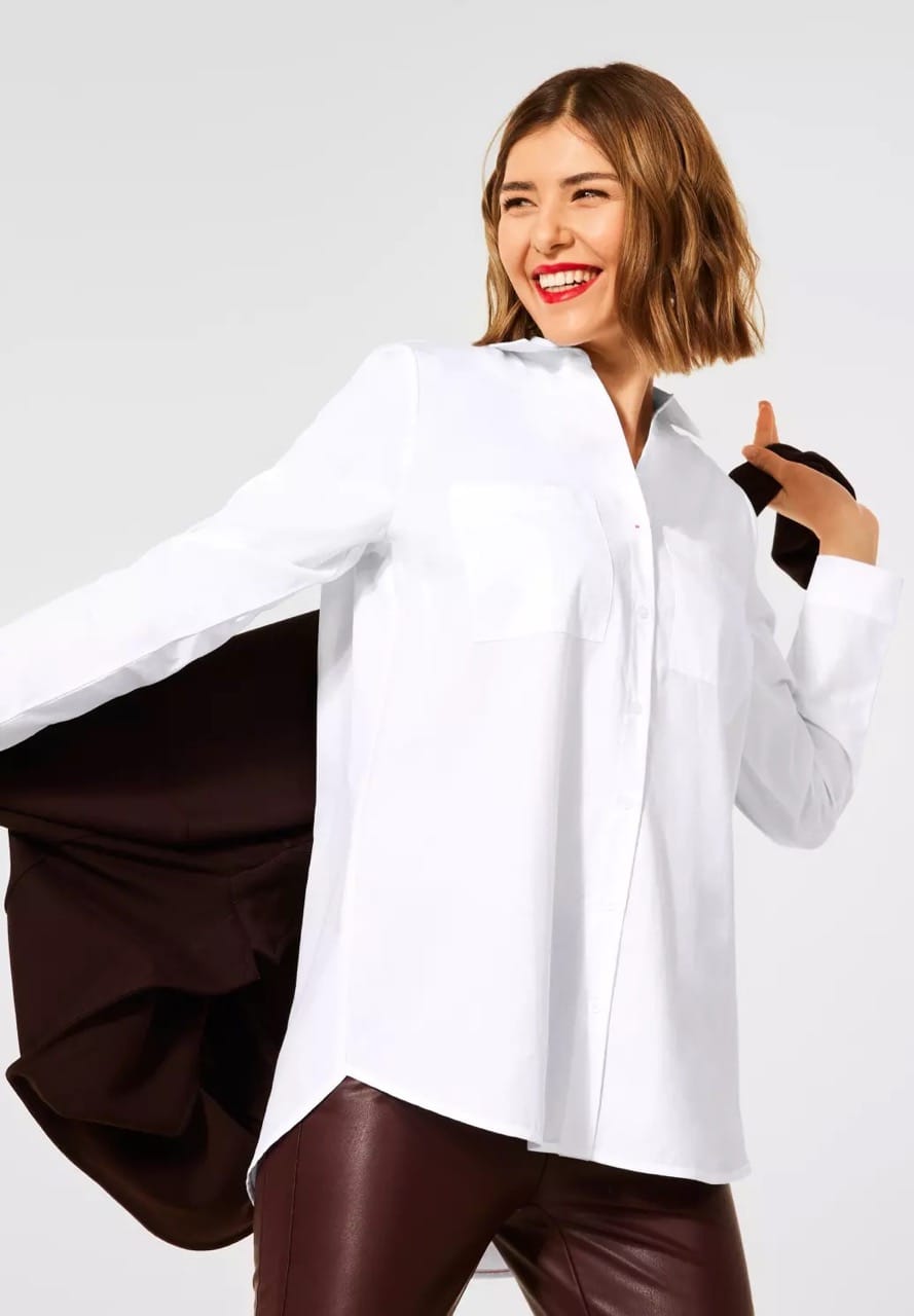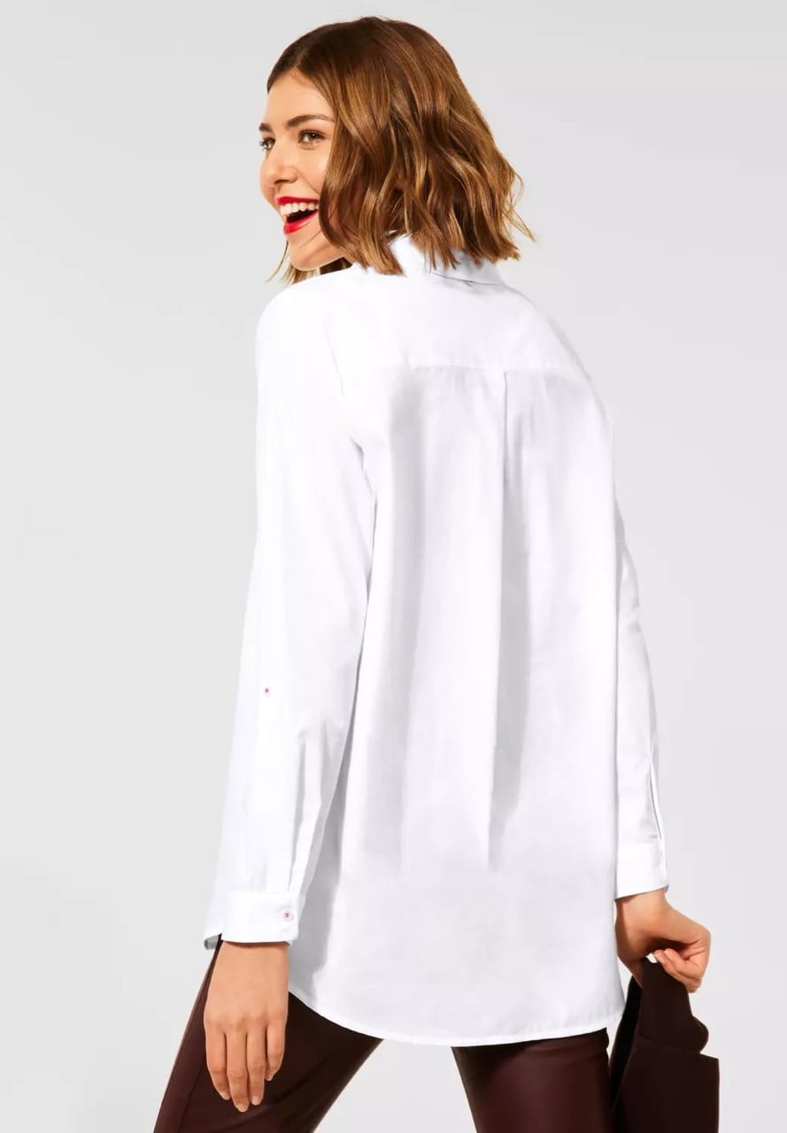 Street One Blouses A342976 4063052672997 Blouse van Street One met een overhemdkraag, lange mouwen, knoopsluiting, twee borstzakken en een iets langere achterzijde. Materiaal: Katoen 100% |