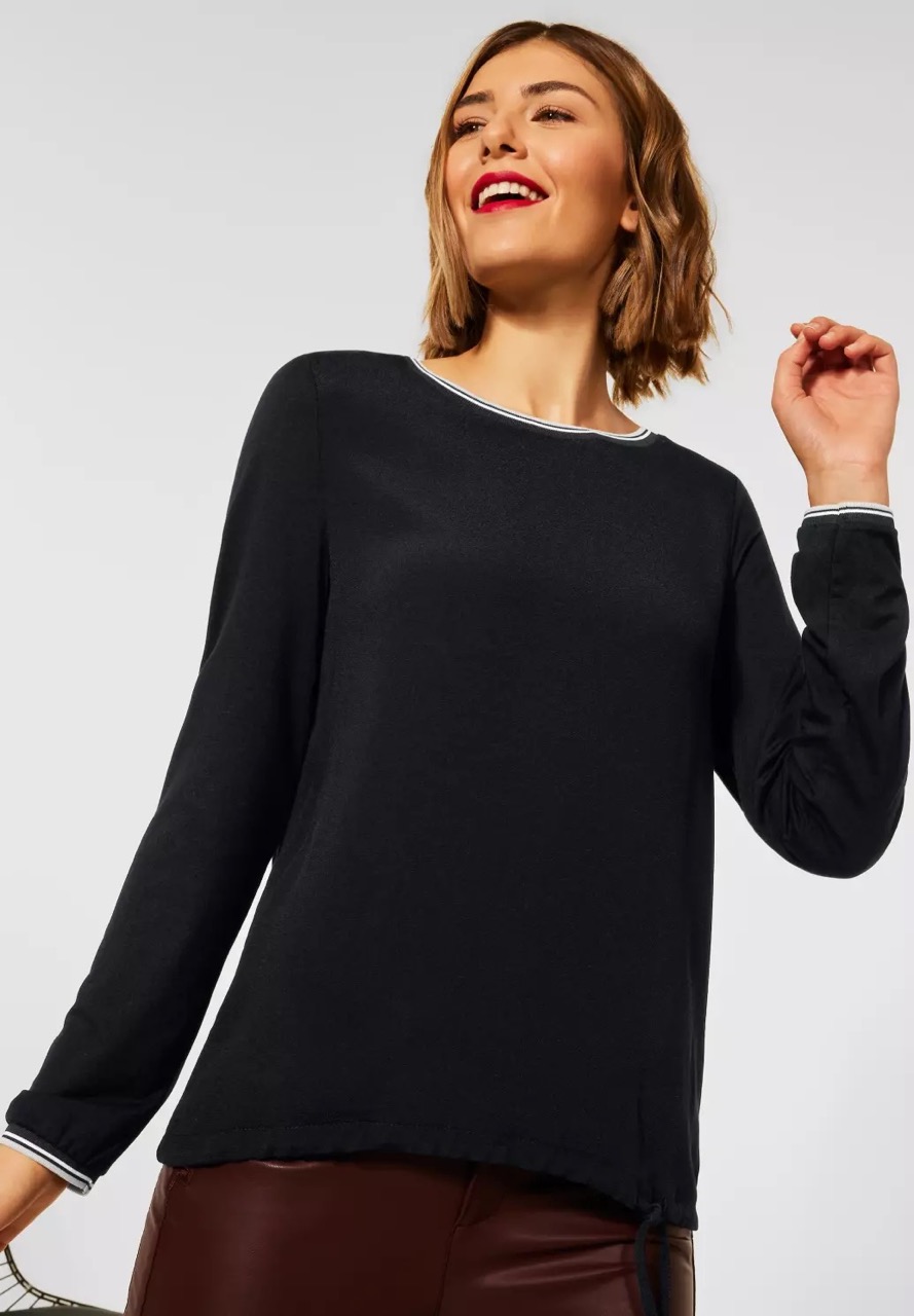Street One Tops en Shirts A317271 zwart 4063052662974 Sportief shirt van Street One met lange mouwen, trekkoord in de zoom, ronde hals en ribboorden voorzien van collegestrepen. Materiaal: Viscose 100% |