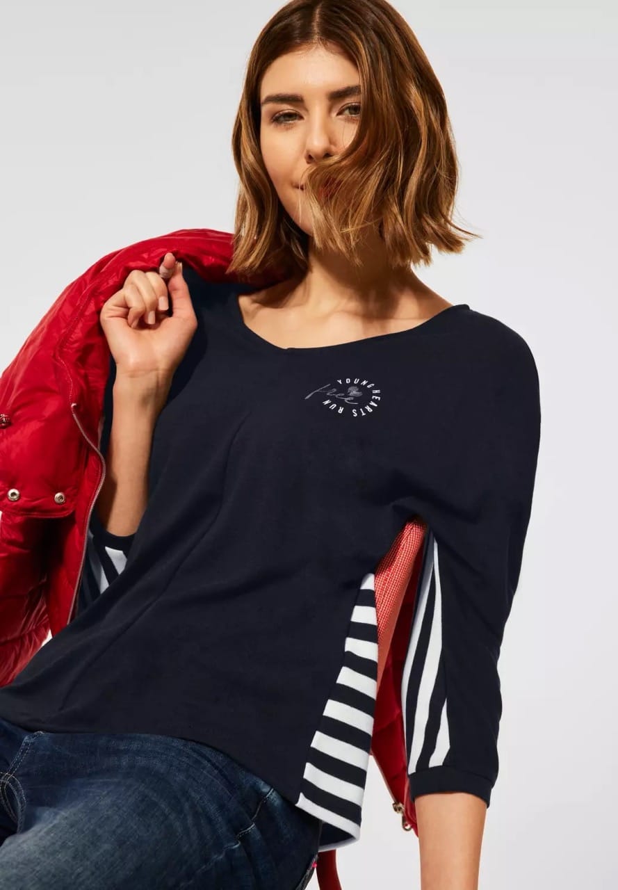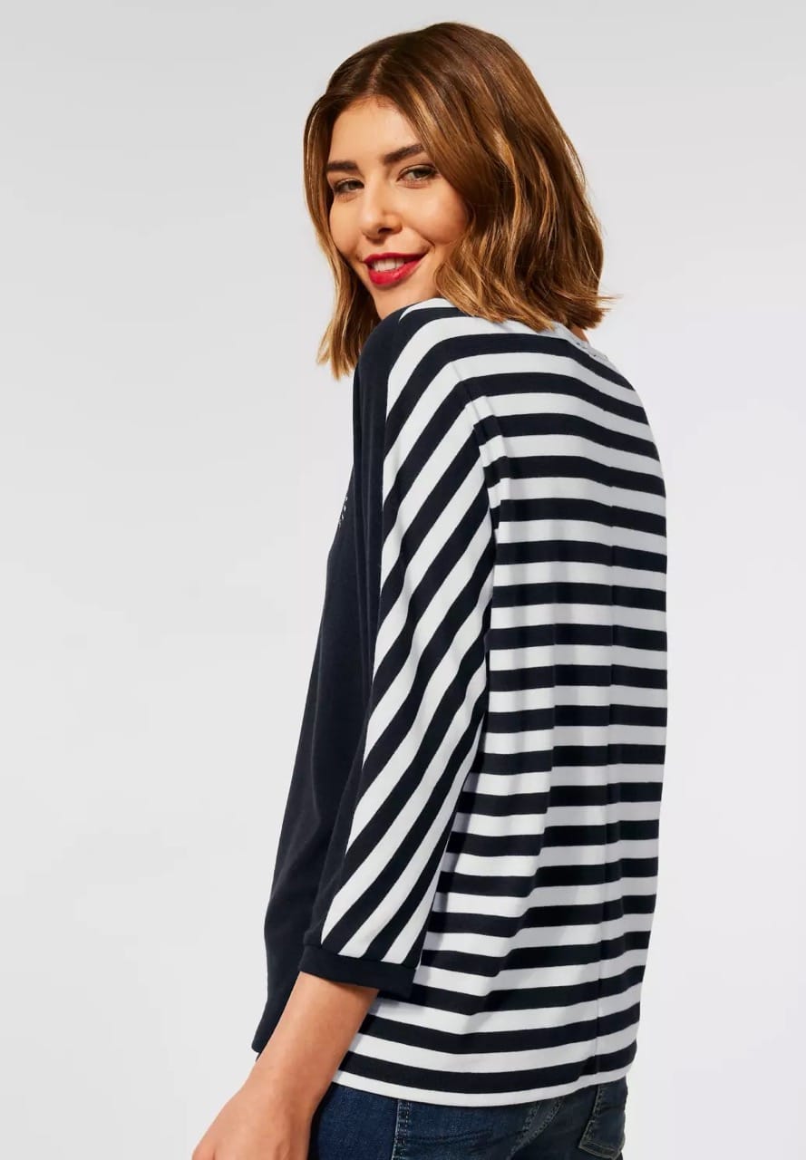 Street One Truien en Vesten A317364 4063052727895 Shirt van Street One met een gestreepte achterzijde, driekwart mouwen, ronde hals en een logoprint aan de voorzijde. Materiaal: Polyester 61%| viscose 33%| elastan 6% |