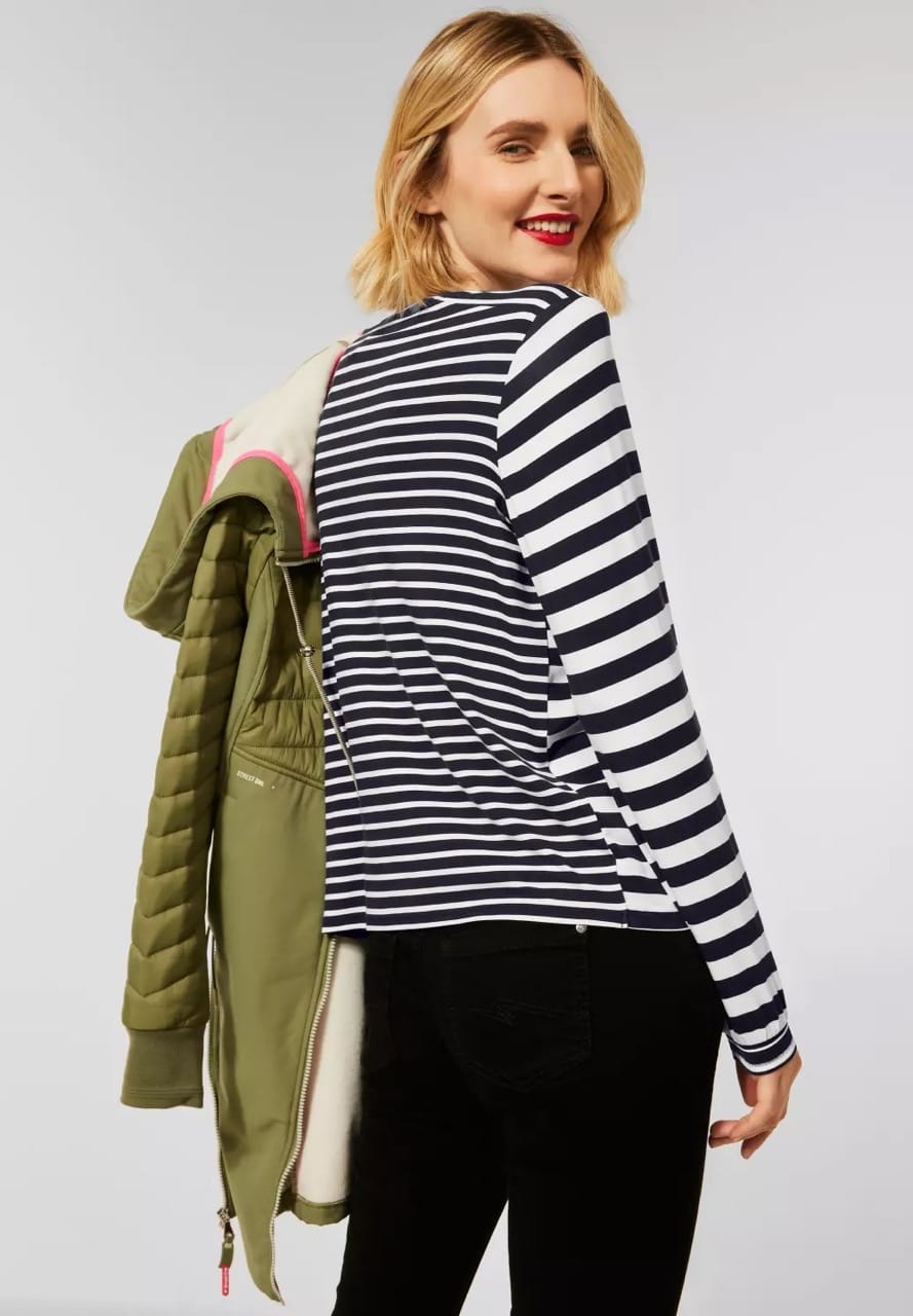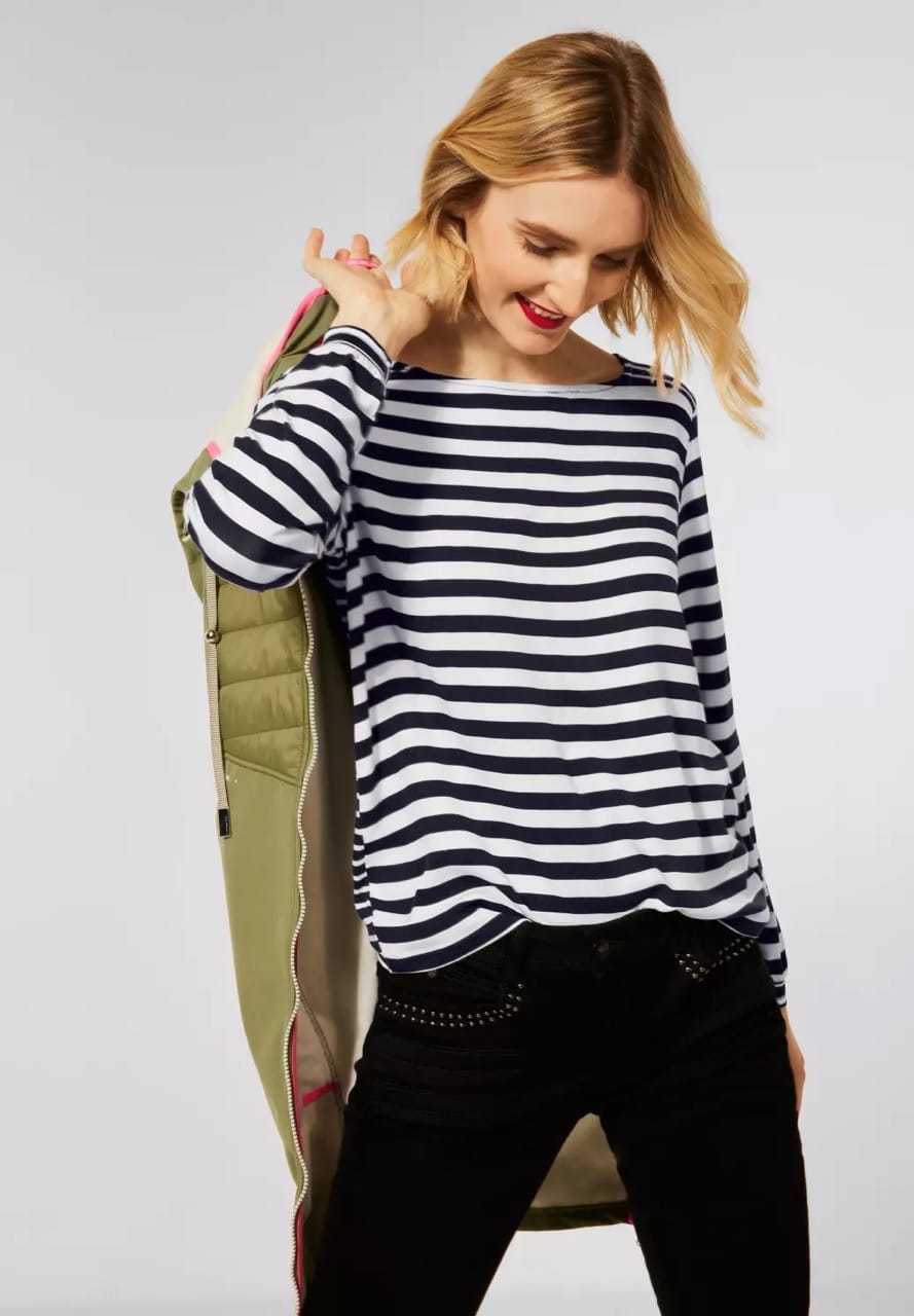 Street One Blouses A317365 4063052729837 Gestreept shirt van Street One in een materialen mix met lange mouwen voorzien van elastische manchetten en een boothals. Materiaal: Voorkant viscose 100%. Achterkant EcoVero Viscose 95%| elastan 5% |